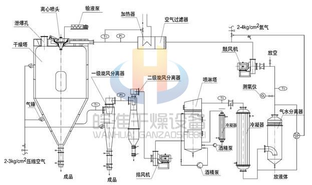閉式循環噴霧干燥機系統由噴霧干燥機主機、帶空氣過濾器的加熱器、鼓風機、水氣分離器、大小冷卻塔、噴淋塔、排風機、一級旋風分離器、二級旋風分離器、泵、測氧儀以及管路與控制閥等組成。